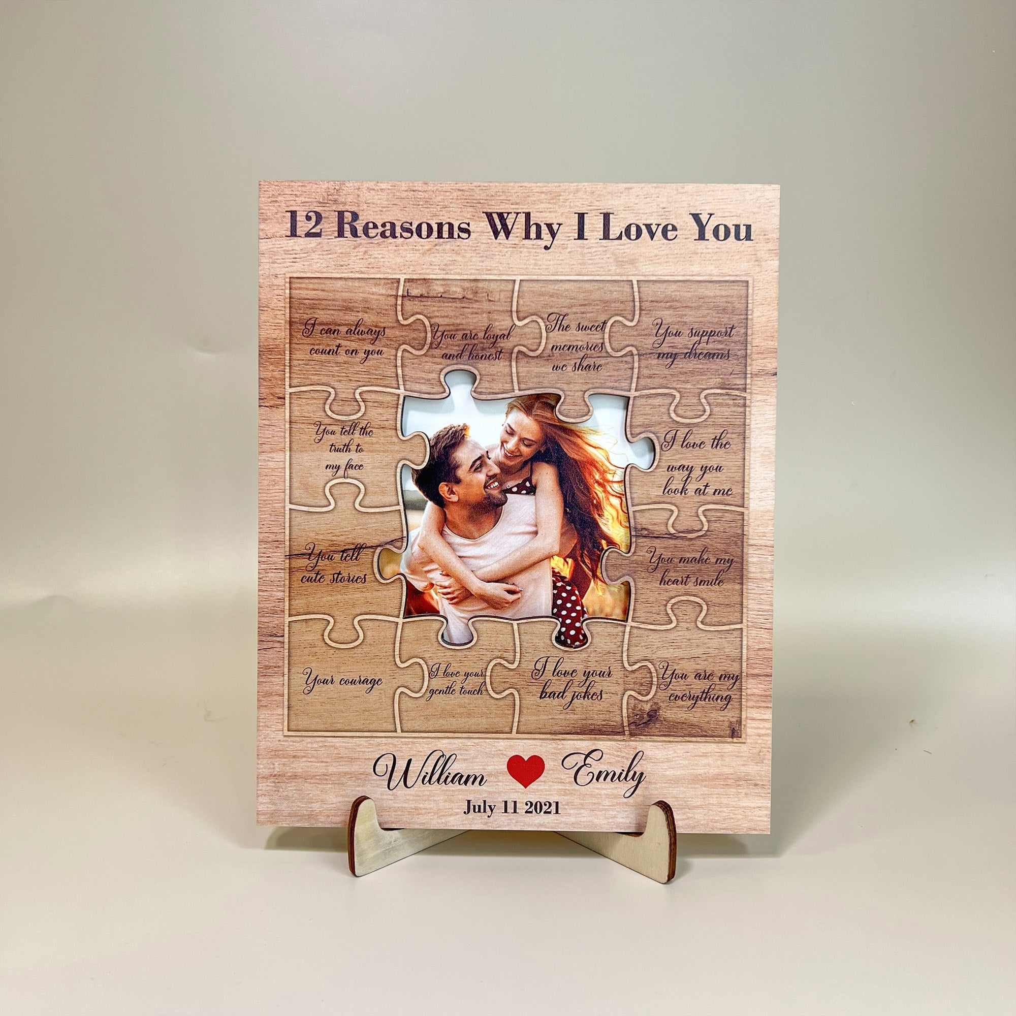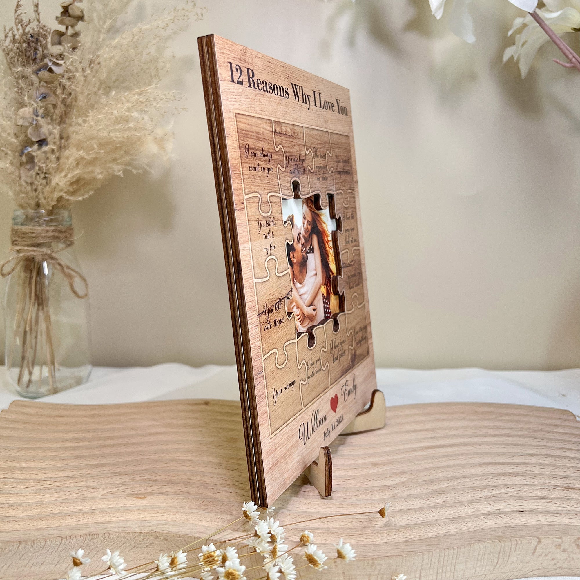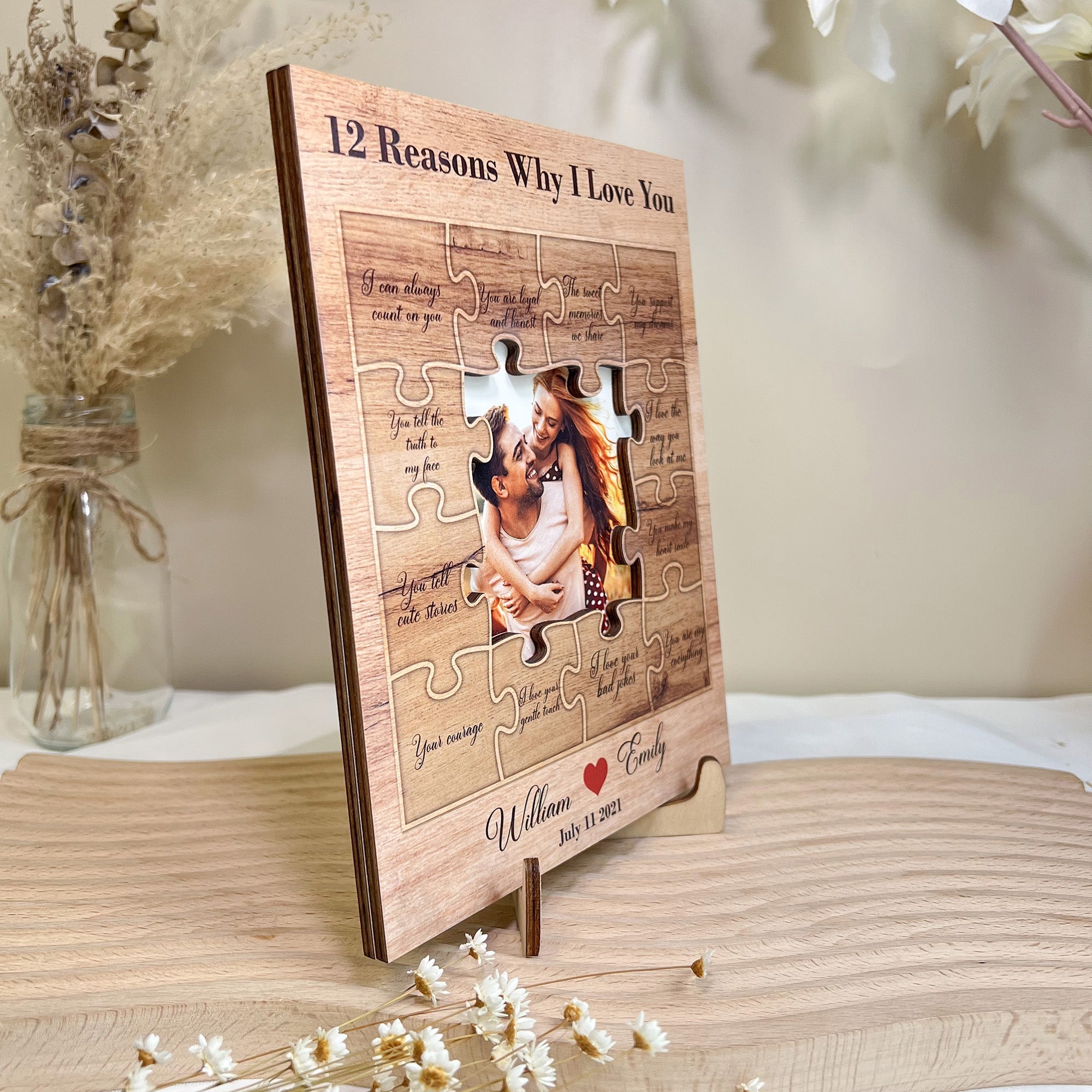 Each of the "12 Reasons Why I Love You" is delicately engraved onto the wooden surface, creating a timeless and intimate keepsake. The wooden material adds a touch of elegance, making it a beautiful addition to your home decor.