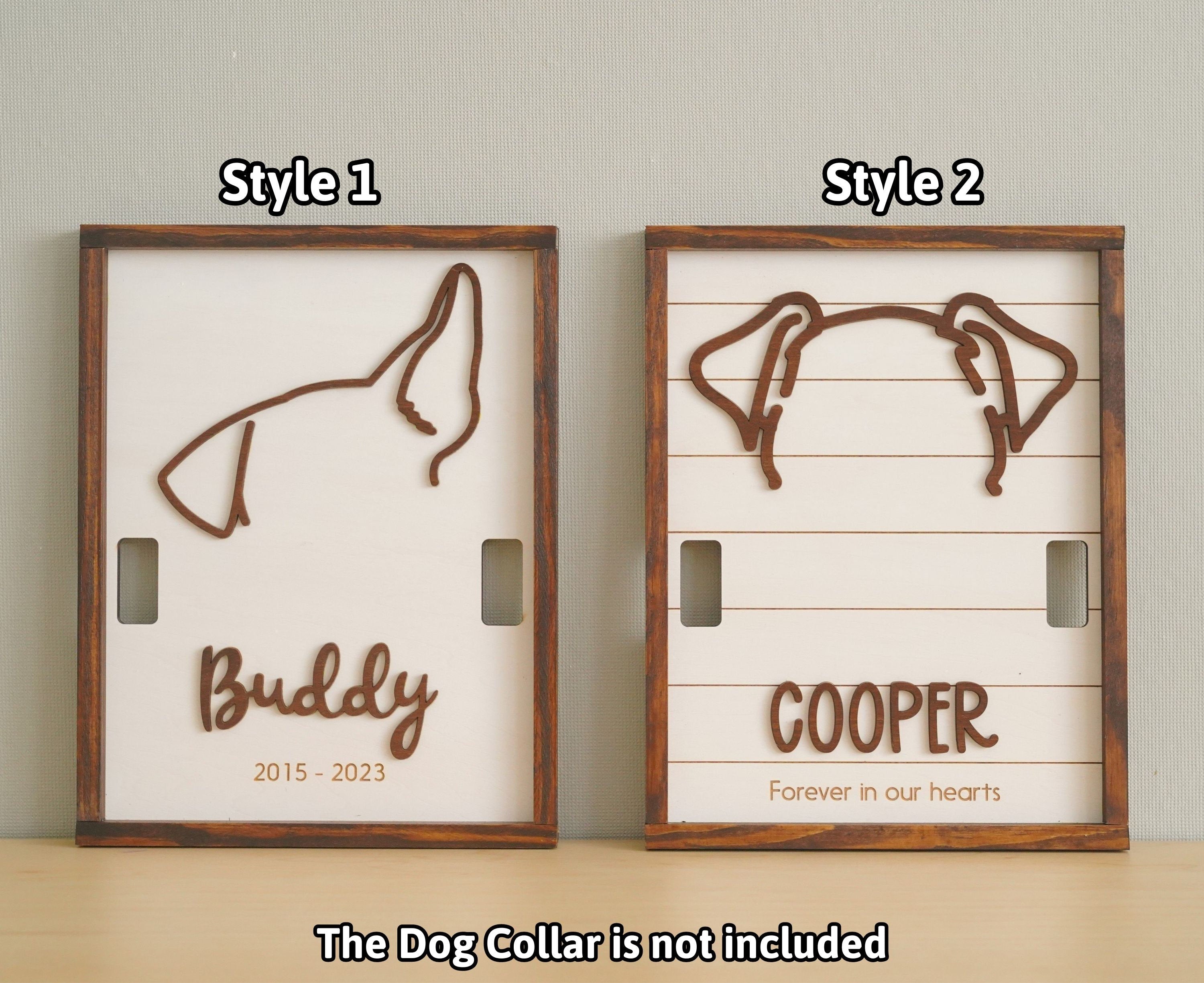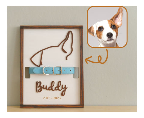 Create a heartfelt tribute to your beloved pet with our "Memorial Pet Collar Frame." This custom collar holder serves as a touching memorial keepsake and a dog remembrance gift. Preserve your pet's memory with a unique pet memorial sign, a lasting tribute to a cherished family friend.